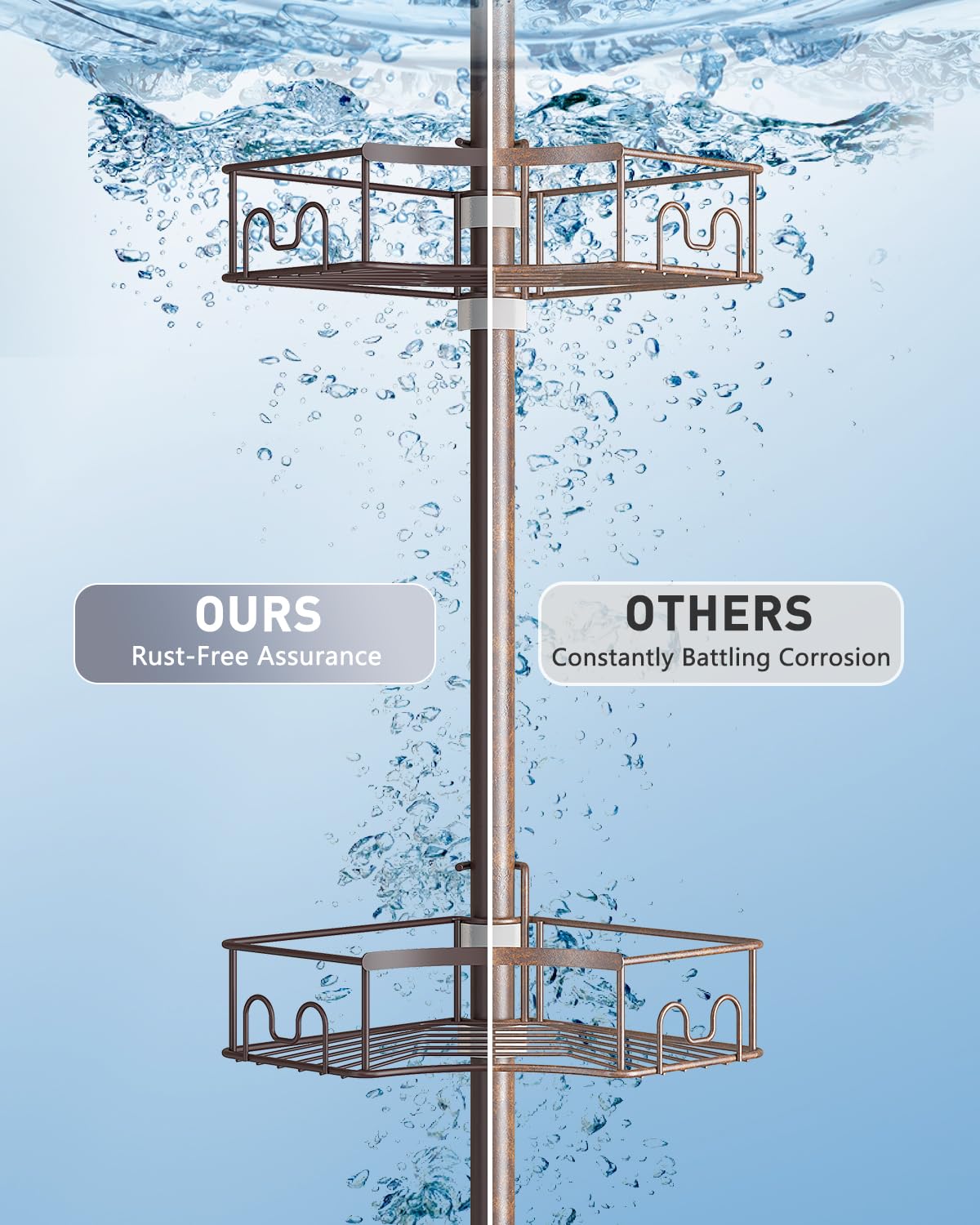 - [RustProof Material] Say goodbye to rust worries with our shower caddy tension pole! Crafted from premium stainless steel, this corner shower caddy ensures both the poles and shelves remain resilient against rust, ensuring long-lasting durability. Whether enhancing your bathroom decor, optimizing space in a college dorm, or adding convenience to your vanity area, this dependable shower corner shelf offers the perfect solution for maintaining enduring organization and accessibility