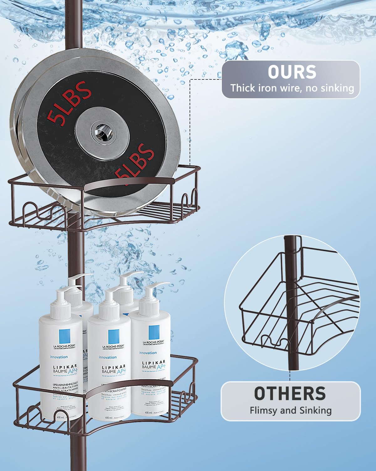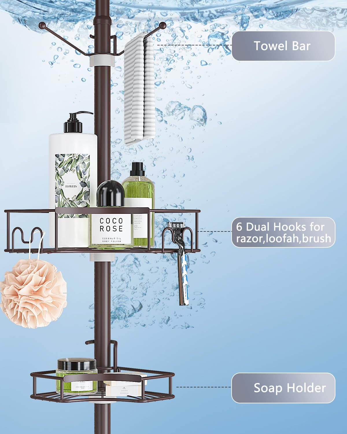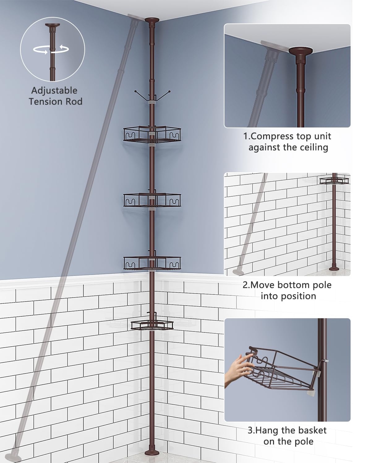 - [Hassle-Free Adjustability] Say goodbye to complicated installations with our shower corner caddy. Unlike traditional shower racks for inside the shower, our caddy offers effortless adjustability. Just hang and position the baskets on the pole using the provided rubber wedges—no tools required. With this simple setup, you can easily customize the caddy's placement to suit your preferences, providing a user-friendly solution tailored to your needs